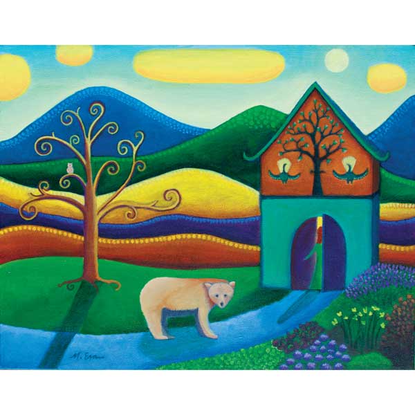 Attempting something new sometimes involves moving through one’s fears. When I experience a worrisome undercurrent as I begin a new endeavor, it helps to surround myself with soothing and strengthening imagery. In this painting I created a sanctuary, with many symbols to support a new undertaking. One could imagine how the white ‘spirit bear’ serves as companion and protector, the owl brings insight, the tree of life reminds us of the spiraling flow of continuity, the garden represents life-giving beauty, and the glowing temple welcomes us into the new stage we have chosen to enter.